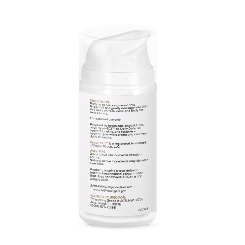REPYR-SC1™ Daily Defense Moisturizer is your skin’s daily armor against stress and dryness. Infused with 500mg of full-spectrum REPYR-SC1™ oil, this formula combines calming botanicals and replenishing actives like shea butter, avocado oil, green tea extract, and hyaluronic acid. Whether you’re starting your morning or winding down at night, Daily Defense helps maintain skin’s natural balance while restoring softness and hydration.